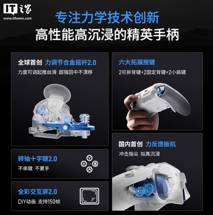 除此之外,手柄升级到转轴十字键 2.0、全彩交互屏 2.0,主控芯片性能提升 350% 至 216MHz,摇杆延迟低至有线 3ms、无线 5ms 输入响应更线性、更精准、更灵敏。