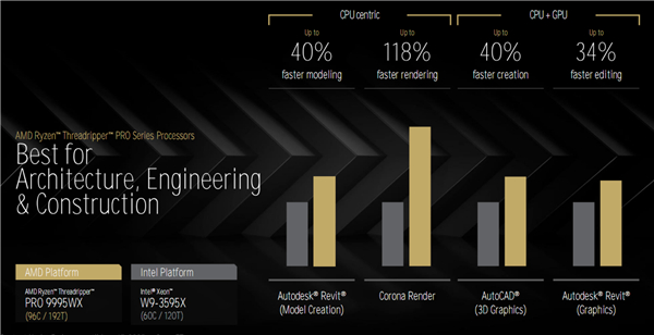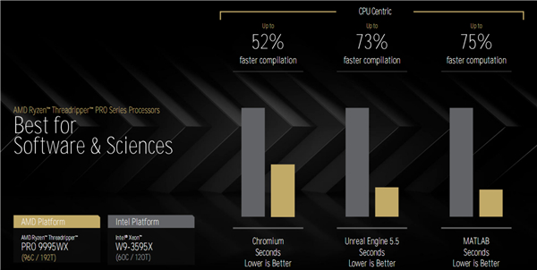 PRO 9995WX对比友商最好的工作站处理器至强W9-3595X(60核心120线程),那就是妥妥的全程碾压了,尤其是在CPU敏感型应用中,可以轻松取得超过1倍的领先优势。