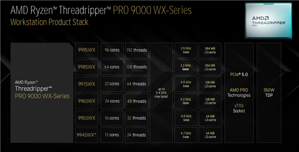 9995WX 96核心、9985WX 64核心、9975WX 32核心、9965WX 24核心、9955WX 16核心、9945WX 12核心。
