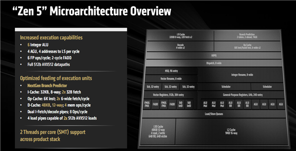 关于Zen5架构的细节变化,我们之前已经做过详细解读,这里不再赘述,只需注意几个关键点:整数ALU单元增至6个以提升处理能力、新一代分支预测精度更高、一级指令缓存拾取容量翻番、一级数据缓存容量增大一半至48KB并支持12路关联、op-cache缓存每时钟周期拾取宽度翻番至6个,等等。