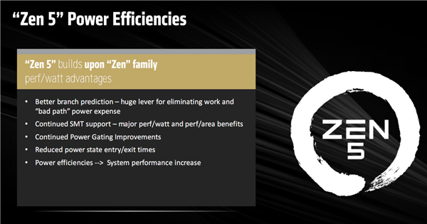 更高的能效也是Zen5架构的一大亮点,包括提升分支预测精度以工作量并显著降低“错误路径”的功耗开销、提升同步多线程的效率以改善单位面积功耗、继续改进功耗栅极、缩短电源状态的切换时间。