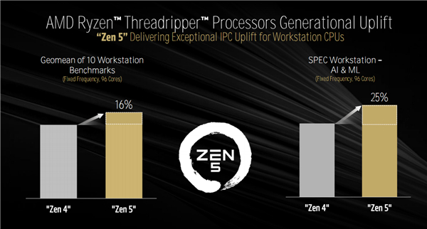 按照官方说法,Zen5对比Zen4,在10个工作站基准测试中平均IPC提升幅度为16%,SPEC AI/ML平均IPC提升幅度更是达到了25%。