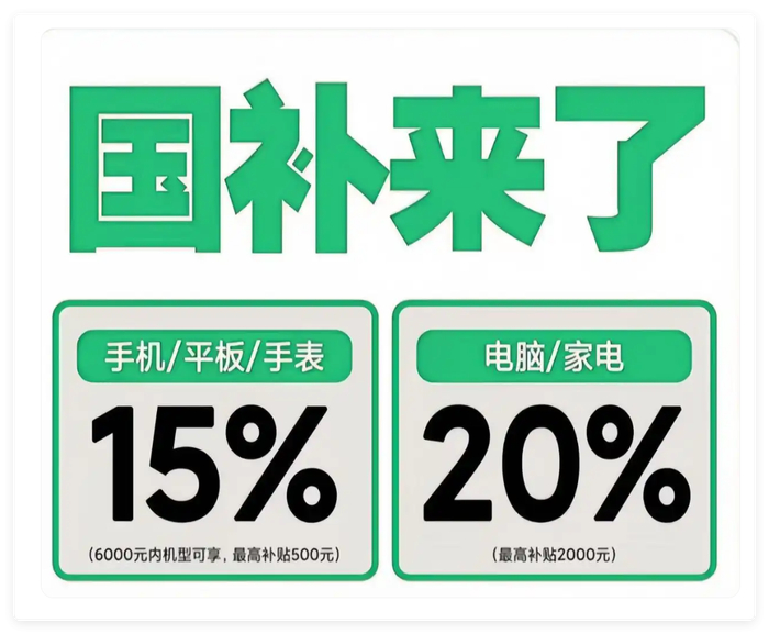 - 手机、平板、智能手表(单价≤6000元)补【15%】,最高500元。