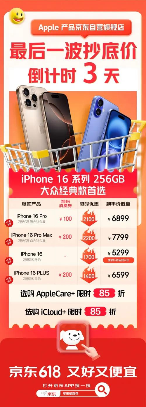 京东的表现则更为出色。同样是官方立减1400元,京东还提供不限量的600元超级爆品券可叠加使用,直接将该机型的价格降至7999元,与天猫、美团价格一致。但京东的杀手锏在于每天上午10点开始发放的“盛夏焕新3C数码消费券”,全国通用,面值分别为500元、400元、300元、200元、100元。256GB版本的iPhone 16 Pro Max可用200元消费券,到手价低至7799元,加购AppleCare+和iCloud还能享限时85折优惠。