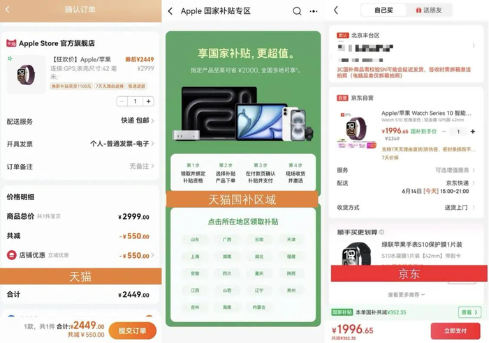 不仅如此,京东在Apple Watch的优惠上也表现出色。以Apple Watch Series 10+梅子色回环式运动表带为例,原价2999元。美团闪购暂无此款机型;天猫享立减550元优惠,到手价2449元起;京东到手价与天猫同价,为2449元起。但一位北京的网友表示,京东有15%的国补优惠,国补到手价只需要1996.65元,而天猫北京用户则不享受国补优惠。这说明,即使是同款机型、同一城市的用户,在不同平台享受到的优惠和服务也不尽相同。