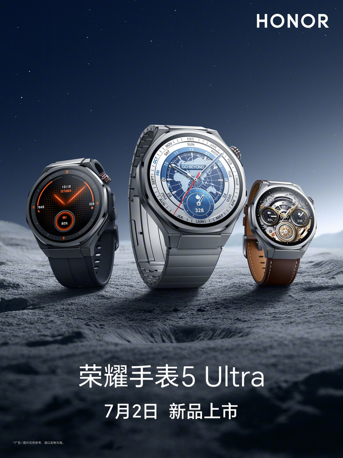 荣耀手表 5 Ultra 官宣 7 月 2 日上市:航天级钛合金机身、八边形太空舷窗设计