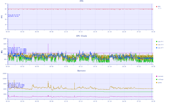 以《原神》为例,在30分钟的跑图测试中,我们这台Xiaomi Pad 7S Pro的平均帧率可以达到59.84FPS,游戏过程十分流畅,没有出现卡顿掉帧的情况。我们还记录了这段游戏测试后的平均功耗为6.4W,对于一款大屏平板而言已经是相当出色的能耗表现。