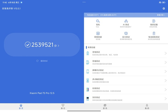 在安兔兔跑分中,我们这台Xiaomi Pad 7S Pro取得了253万分的成绩,与一些骁龙8至尊版和天玑9400的设备实力相当。这样的旗舰级性能表现足以应对各类重载场景与日常使用的需求。