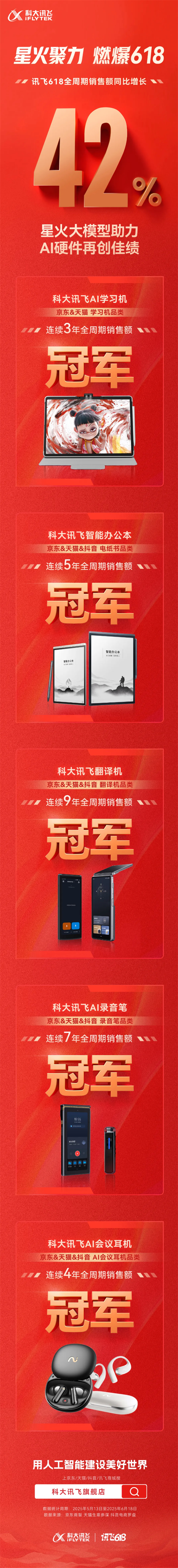 科大讯飞AI硬件“618”销售额同比增长42%:拿下5个品类销售额冠军
