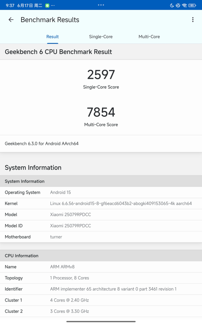 Geekbench 6的话,整机单核心分数为2597,多核心分数为7854。