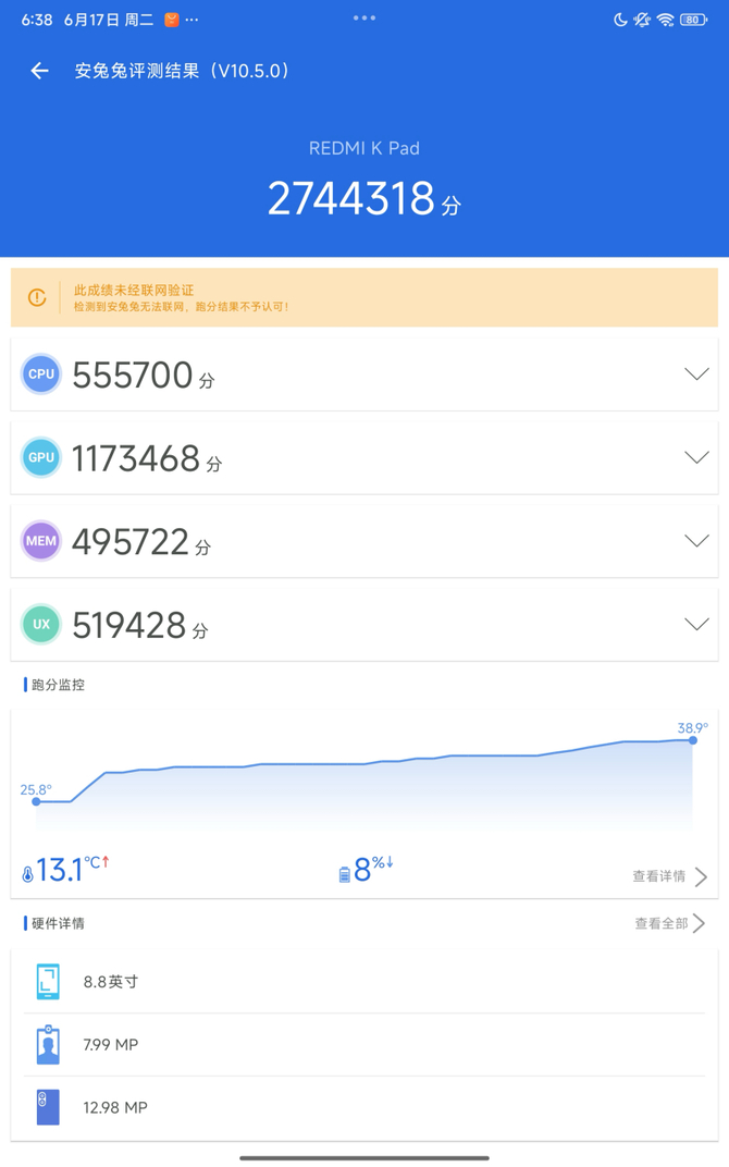 配合上这次的SoC中置的架构设计和平板先天超大的背部面积,让REDMI K Pad的散热表现极为突出,实现至高10W功耗的性能稳定释放,下面我们来看看实际性能表现。