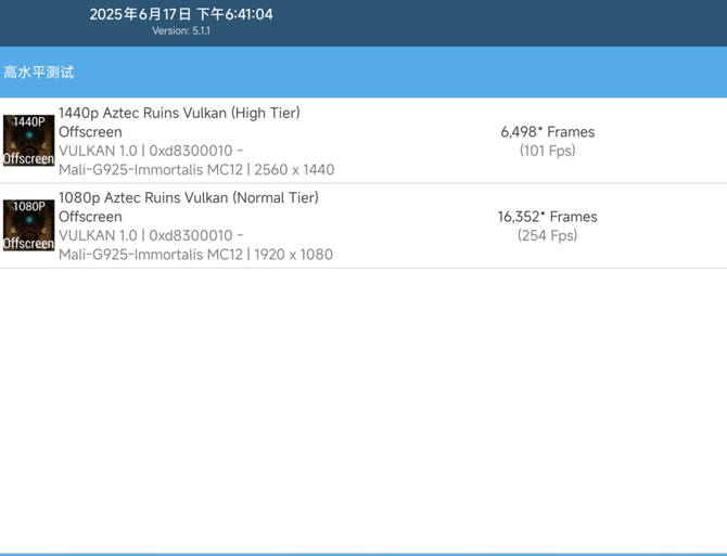 GFX Bench跑分的话,上面的两个测试可以看到1440P的Aztec Ruins Vulkan跑分为101FPS,1080P的Aztec Ruins Vulkan的跑分为254FPS。