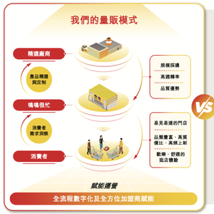消费行业投资人郝力向「定焦One」解释,一是通过加盟商铺开线下门店规模形成渠道优势,提高采购规模,形成上游议价权,降低采购成本;二是向品牌厂商进行直采,去掉中间经销商环节,同时缩短供应商的账期,降低流通成本;三是通过标准化的店铺运营,减少导购员等人力开支,保持低价优势。