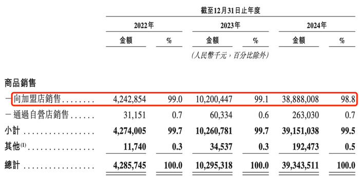 正如蜜雪冰城并非靠直接售卖奶茶盈利,而是通过向加盟商出售原料赚钱一样,鸣鸣很忙的商业模式也是通过向加盟商供货来赚取差价。招股书显示,2022年至2024年期间,鸣鸣很忙的收入中,平均有99%都来源于向加盟店销售商品。