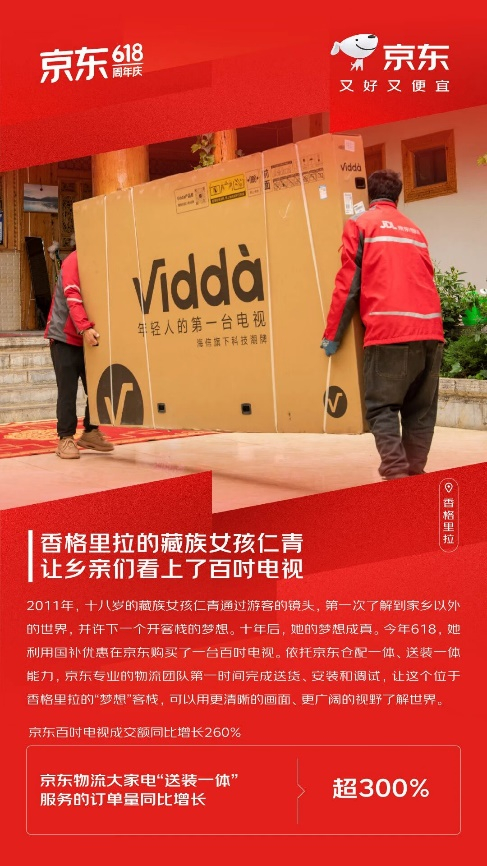 100英寸的屏幕装下的不仅是世界各地的生活模样,更有十年前那个藏族女孩对远方的向往和渴望。看清更远处的世界,还有很多人像仁青一样,在这个京东618感受到了向外看的幸福。京东618期间,京东百吋电视成交额同比增长260%,购买85英寸以上大屏电视的用户占比已超35%,京东的大家电“送装一体”服务的订单量同比增长超300%。