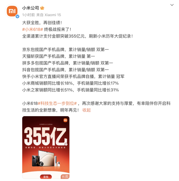 截至6月18日23:59:59,小米全渠道累计支付金额突破355亿元,刷新小米历年大促纪录,再创新高。