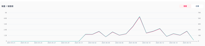 销量趋势图显示,这款产品上架后不久就开始日售千单,并在6月9号创下5000+的销量峰值。上架初期卖家大手笔地烧商品卡,为产品争取到了大波平台推流,同时联动了多位带货达人助攻,为产品积攒了口碑,带来了销量。