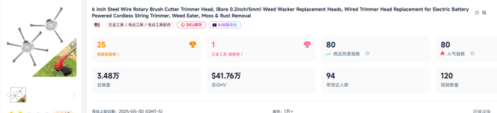 数据显示,这款钢丝轮打草头配件于5月30日上架TikTok Shop,至今已经售出3.48万单,达成41.76万美元GMV,目前是TikTok美区五金类目排名第一的产品。