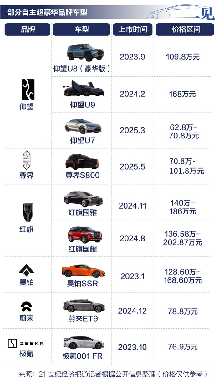 这为自主品牌的崛起提供了机会。自2023年开始,已经有至少11款车型加入了超豪华市场。今年以来,战火升级,至少有包括尊界、极氪和长城的“自信汽车”在内的三家国内品牌在冲刺超豪华市场,而长城的“自信汽车”由魏建军亲自挂帅。