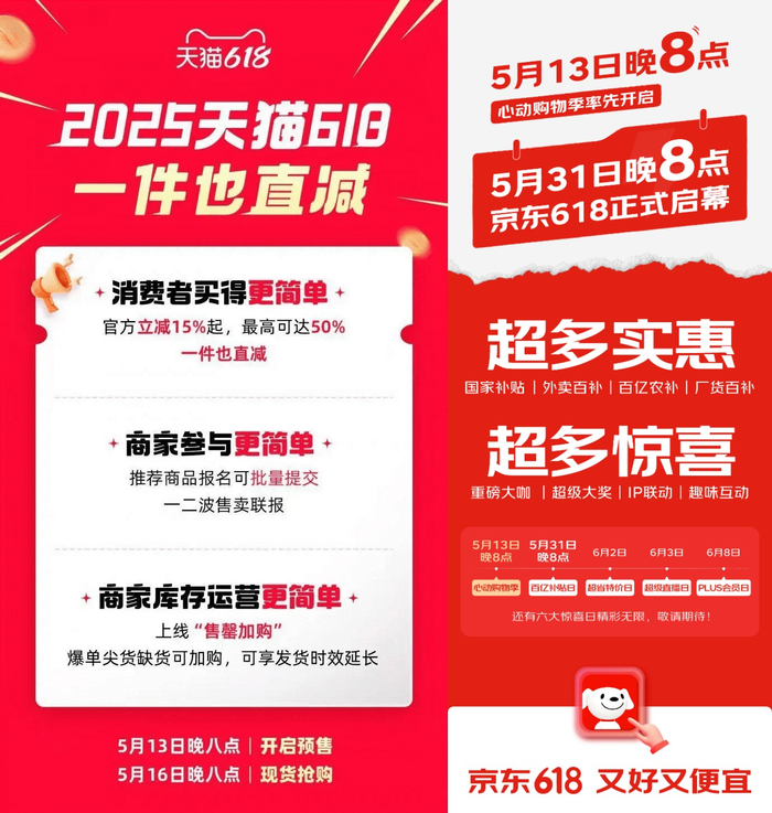 此外,今年各大电商平台的促销玩法也有不少调整:淘宝取消了跨店满减,取而代之的是买一件也能立减,优惠力度最高可达50%;京东则在原有促销优惠的基础上,叠加“国家补贴+外卖百亿补贴”双引擎;抖音同样强调“一件直降” 并投入亿级现金补贴和千亿级流量资源。