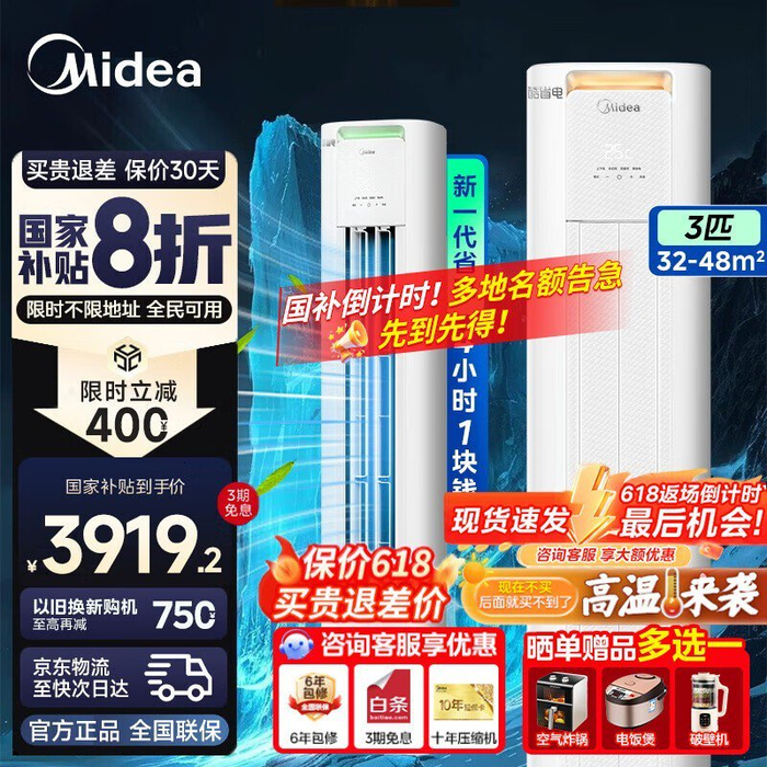 美的酷省电Pro空调立柜式3匹新一级能效限时特惠