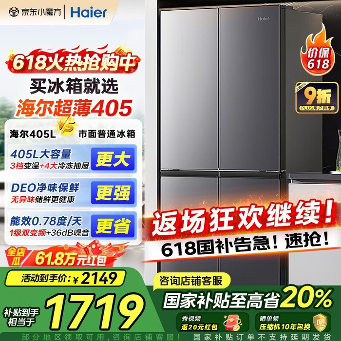 海尔405L风冷十字门冰箱低至1478元