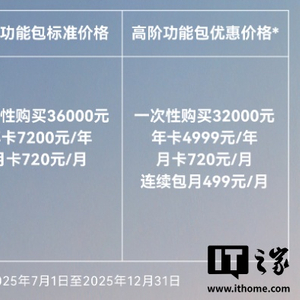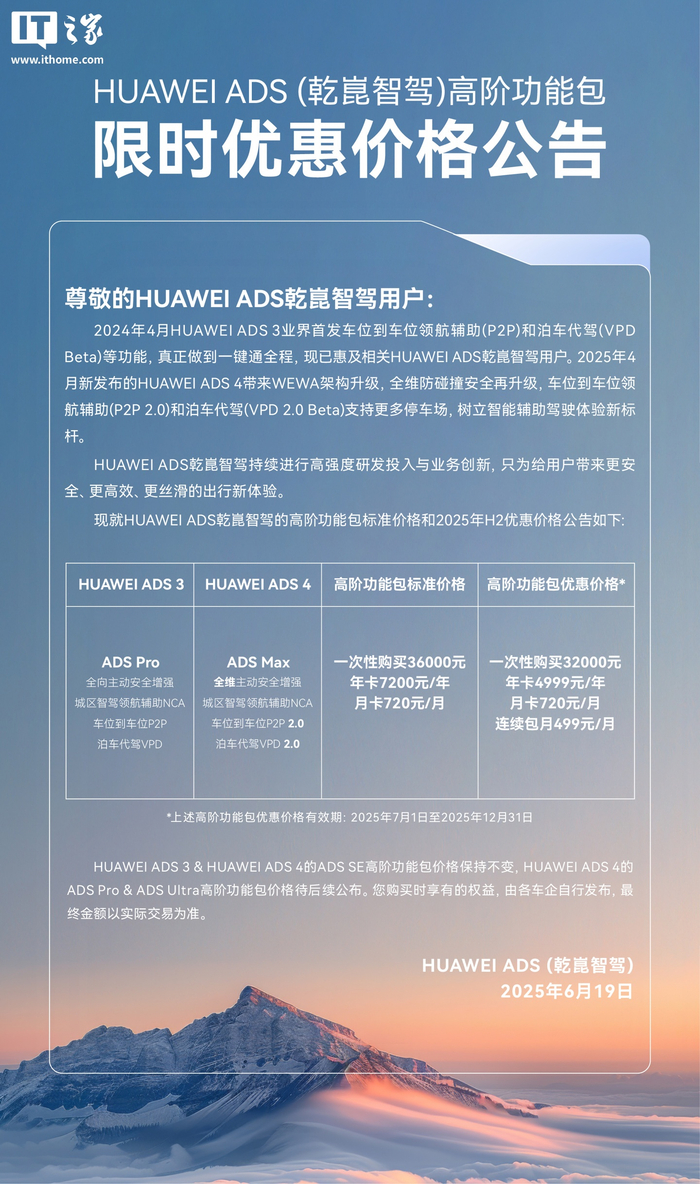IT之家注意到,公告中提到,这些优惠价格的有效期为 2025 年 7 月 1 日至 2025 年 12 月 31 日。此外,华为还表示,ADS 3 和 ADS 4 的 ADS SE 高阶功能包价格将保持不变,而 ADS 4 的 ADS Pro 和 ADS Ultra 高阶功能包价格将待后续公布。
