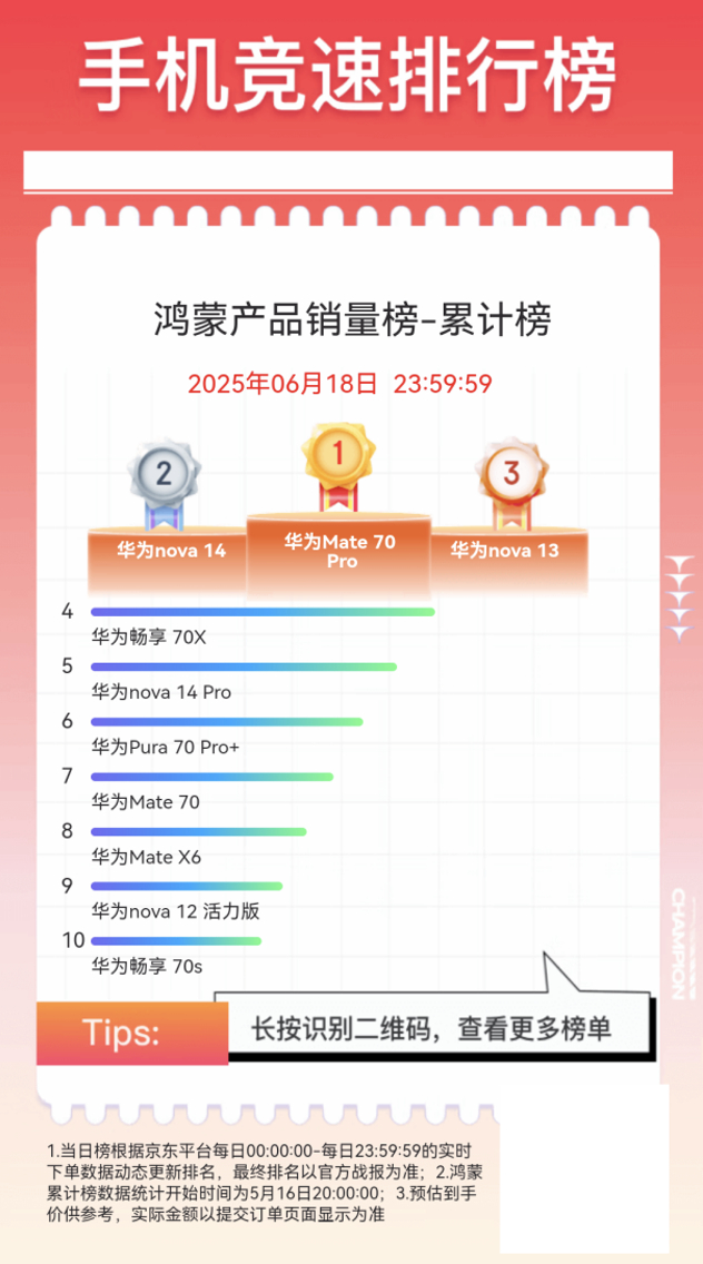 值得一提的是,今年京东618手机竞速榜还专门为鸿蒙产品设置了榜单,其中鸿蒙产品销量累计榜前三为华为 Mate 70 Pro、华为 nova 14、华为 nova 13。