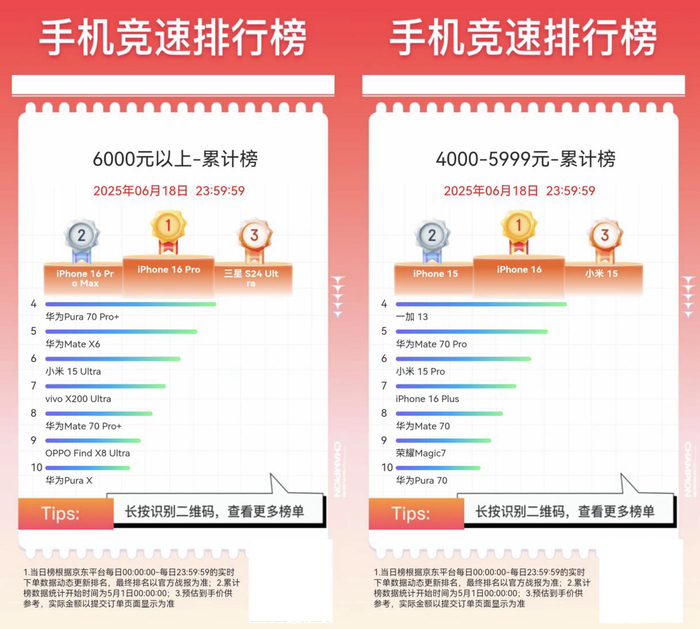 2025年京东618圆满落幕,众多手机品牌迎来全面增长。数据显示,截至6月18日24点,小米、vivo、OPPO、荣耀、iQOO、一加、三星、realme、魅族、摩托罗拉、红魔、努比亚等品牌超50款手机单品成交额破亿;鸿蒙手机成交额同比增长超100%;京东618开始1小时iPhone成交额突破亿元。目前京东618全周期手机竞速榜也已正式出炉,下面就来看看,截至6月18日24点,各品牌、产品获得了怎样的成绩吧。