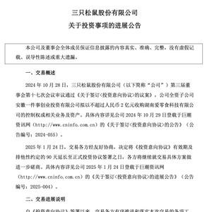 6月16日,三只松鼠发布公告称,此前披露,公司全资子公司安徽一件事创业投资有限公司拟以不超过2亿元收购湖南爱零食科技有限公司的控制权或相关业务及资产。2025年1月24日,交易各方决定将《投资意向协议》有效期及排他性约定的90天延长至正式投资协议签署之日。然而,自《投资意向协议》签署以来,交易各方最终因部分核心条款未达成一致,决定终止本次收购事项。
