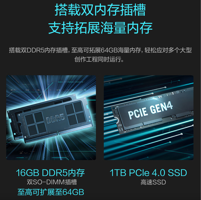同时,机器标配16GB DDR5 5600MHz内存+1TB PCIe 4.0 SSD,双SO-DIMM内存插槽加持下,可以扩展到至高64GB海量内存,多开网页与大型文档依然流畅,后台挂着办公软件也毫不卡顿。