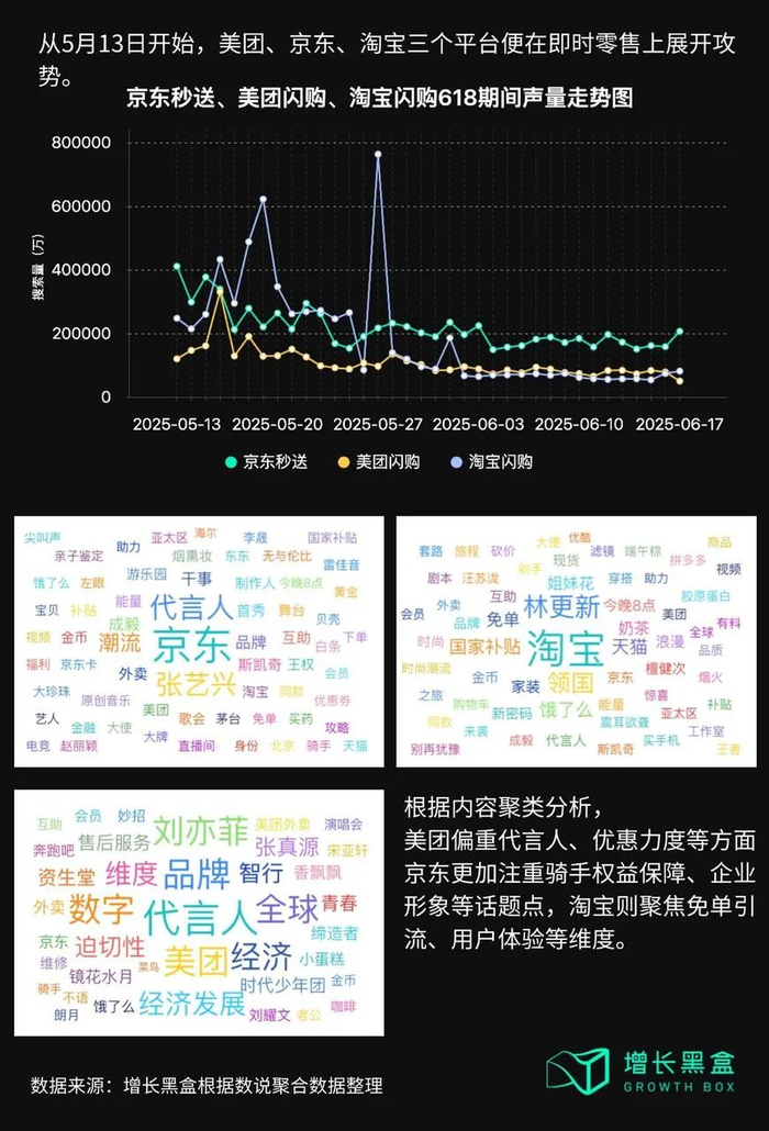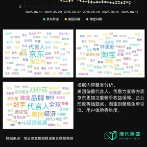 根据增长黑盒数据监测,从5月13日开始,美团、京东、淘宝三个平台便在即时零售上展开攻势。通过内容聚类分析,美团偏重代言人、优惠力度等方面,京东更加注重骑手权益保障、企业形象等话题点,淘宝则聚焦免单引流、用户体验等维度。