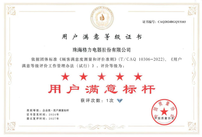 2019年,格力电器的质量技术创新循环D-CTFP上升为国家标准《GB/T 38356-2019质量管理基于顾客需求引领的创新循环指南》;2023年,由格力电器与华南理工大学合作撰写的《追求完美、至臻至善——格力质量模式》入选“21 世纪中国质量最佳实践”系列丛书,2024年格力电器再次荣获中国质量协会授予的“企业市场质量信用AAA级”、“用户满意标杆五星级企业”两项荣誉,彰显了消费者对格力高品质产品的认可,展示了格力作为行业领军者的强劲实力。