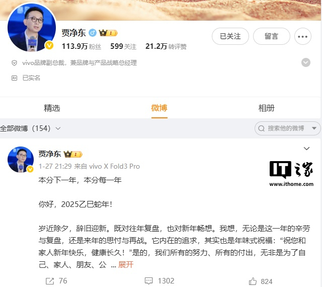 IT之家查询发现,贾净东目前的微博认证还是“vivo 品牌副总裁,兼品牌与产品战略总经理”,最新一条微博停留在今年的 1 月 27 日,主要谈到了 vivo 2025 的新年畅想。