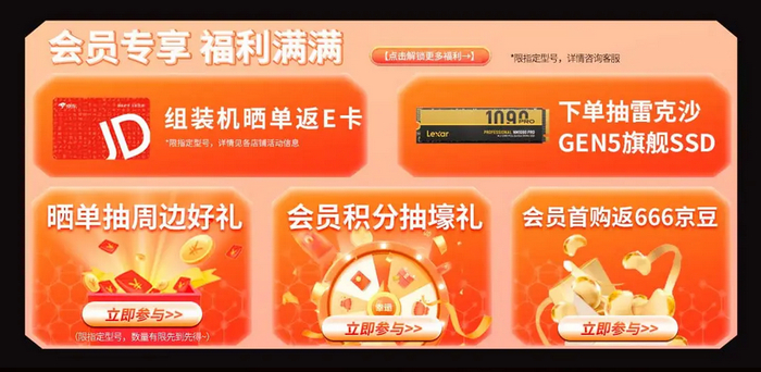 还是请大家一定要先关注AMD京东自营旗舰店,成为会员可以抽取周边好礼,会员首购就返666京豆,累积的积分还能再抽壕礼。活动期间所有用户下单可以参与评价晒单返京东E卡;下单还能抽雷克沙GEN5旗舰SSD。(每项活动限指定型号,请朋友们看清楚下单规则,更多详细活动信息请以页面显示为准)。