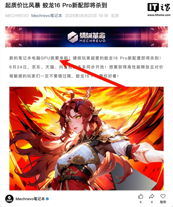 IT之家 6 月 20 日消息,机械革命官方今晚发文,宣布将于 6 月 24 日在多个平台推出一款搭载“新的笔记本电脑 GPU”的蛟龙 16 Pro 新配置,不排除是仍未官宣的 RTX 5050 的可能。