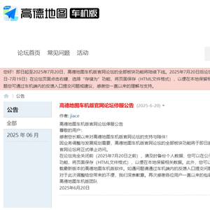 因业务调整与发展规划需要,高德地图车机版官网论坛的全部板块功能将于即日起至 2025 年 7 月 20 日期间陆续下线。自 2025 年 7 月 20 日起,高德地图车机版官网论坛将正式停止访问。