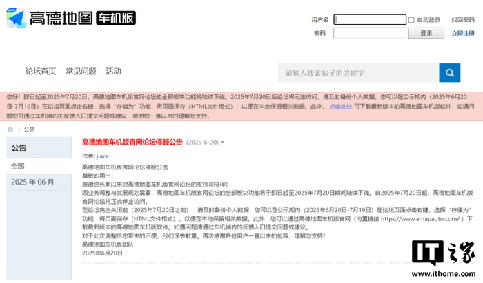 IT之家 6 月 20 日消息,高德地图车机版官网论坛今日发布停服公告: