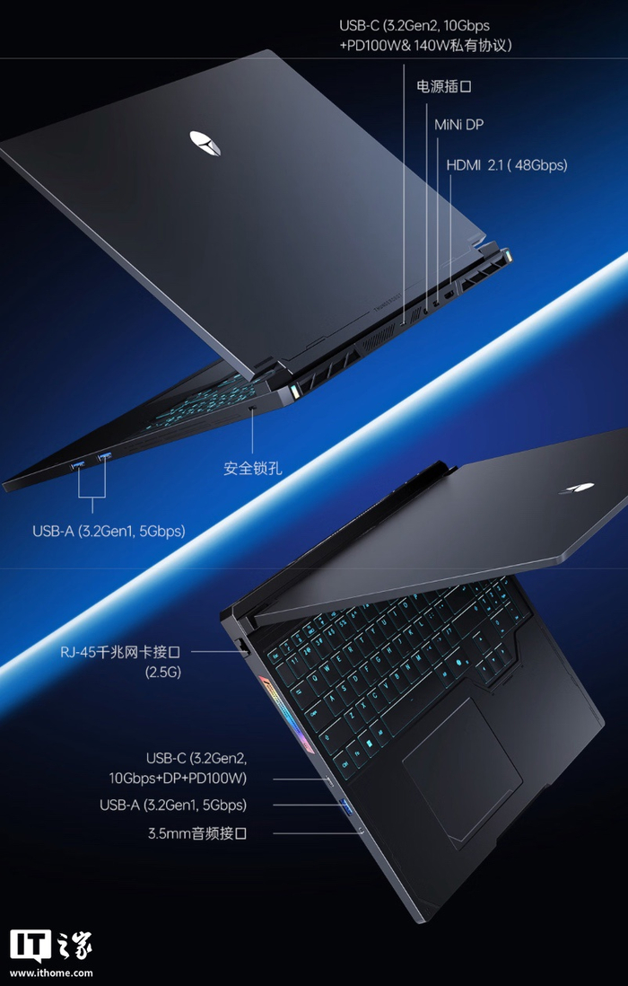 该机 A 面配备镜面雷神 Logo,侧面带有雷神铭牌,支持 180 度开合,提供下沉式全尺寸 RGB 键盘,内置 80Wh 电池(IT之家注:支持 140W 快充),配备 250W 迷你 SiC 充电器。