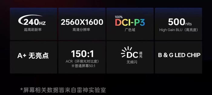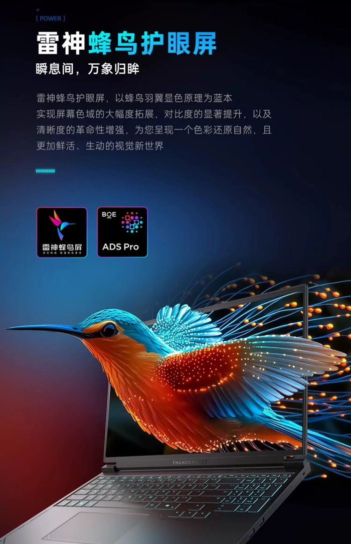 该机配备 16GB DDR5 内存(最高 96GB)和 1TB PCIe 4.0 SSD(双槽),使用双风扇散热,性能释放 180W,风扇噪音 43dB,配备一块 16 英寸 2560x1600 分辨率 240Hz 的京东方蜂鸟护眼屏(亮度 500 尼特,覆盖 100% DCI-P3 色域),厚 23mm,重 2.5kg。