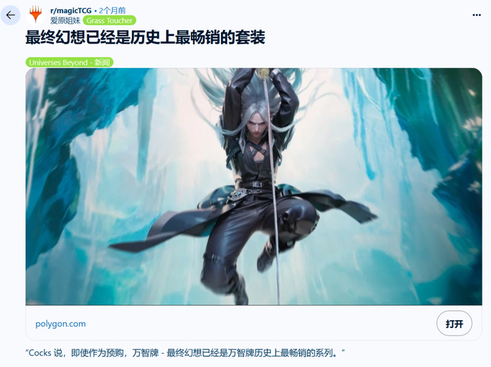 这种充满巧思和彩蛋的诚意,不仅让万智牌和《最终幻想》“双厨”玩家会心一笑,也吸引了挺多原本不玩万智牌的玩家驻足。在4月的投资者电话会议上,孩之宝的CEO透露,《最终幻想》联动系列仅凭预售成绩,就已经是万智牌历史上销售速度最快的系列。