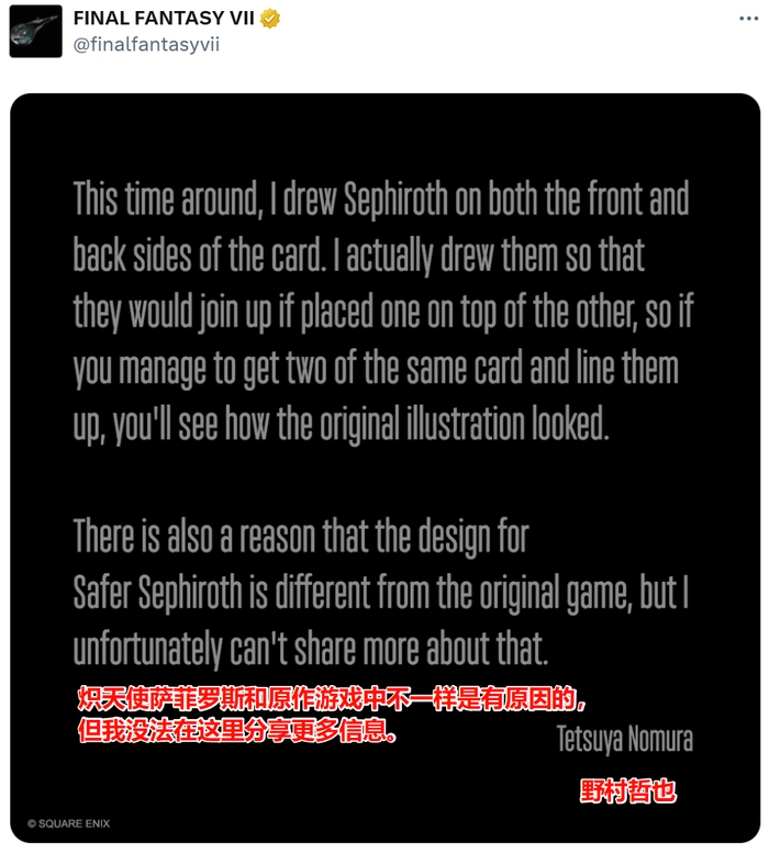 事后,野村直接通过《最终幻想7》的官方X账号解释:“这是有原因的,但是我在这没法说”。