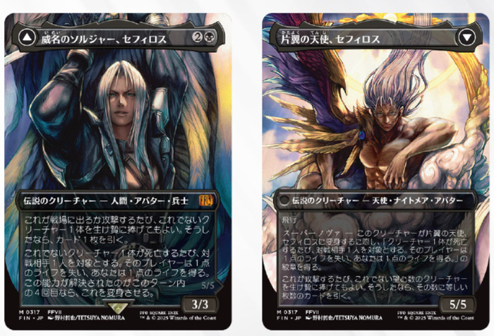 但从最终呈现效果来看,许多卡牌设计完成了这个困难的任务,在保留了人物特点的同时还极具创意。像是《最终幻想7》中的著名反派萨菲罗斯,就采用了双面牌的设计,正面是“传奇神罗战士”,可以牺牲己方生物汲取对手生命,满足条件后翻转为终极形态“片翼天使”,可以肆意牺牲己方生物换取手牌。