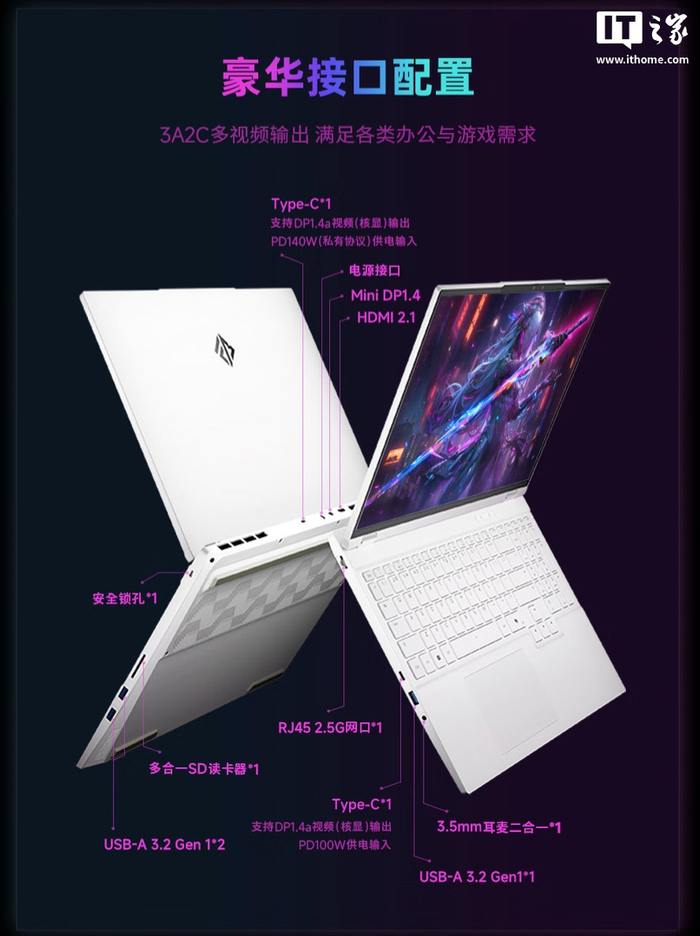 这款笔记本整体重量 2.15 千克,厚度 18.9 毫米,采用 ACD 三面铝合金白色电泳工艺,提供 RGB 全尺寸背光键盘,内置 80Wh 电池,带有轻量化适配器。