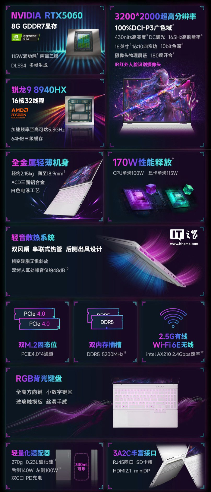 该机搭载 16 核心 32 线程 AMD 锐龙 9-8940HX 处理器,配备 16/32GB DDR5 5200MHz RAM 和 1TB PCIe 4.0 SSD,匹配 RTX5060 115W 显卡,使用双风扇三热管双出风口散热。匹配一块 16 英寸 3200x2000 分辨率 165Hz IPS 面板(覆盖 100% DCI-P3、10-Bit 色深)。
