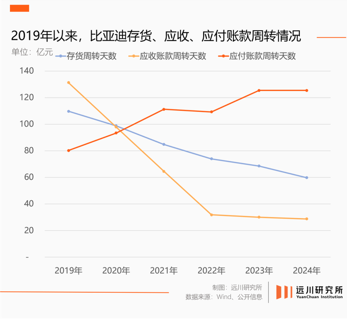 体现在财务上,比亚迪的存货周转天数(原材料变成车的时间)和应收账款周转天数(经销商回款的时间)越来越短。过去五年,两者分别缩短了50天和103天。