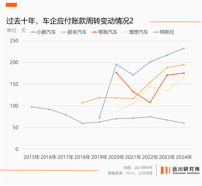 与之对应,同样的五年周期里,比亚迪应付账款周转天数延长了45天。