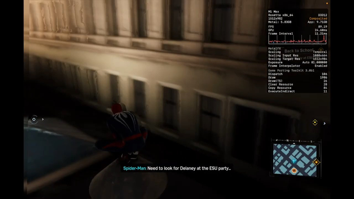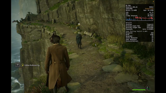 《巫师 3》在 DX11 模式下运行,无法使用帧生成技术。尽管如此,游戏在低画质下帧率超过 120 FPS,充分利用了 MacBook Pro 的 120 Hz ProMotion 显示屏。即使在高画质下,关闭 HairWorks 后,帧率仍稳定在 60-70 FPS。