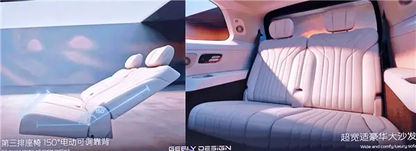 车内为六座布局,提供二三排纯平地板、二排吸顶屏、180mm车内通道、三排靠背150度电动调节以及大尺寸后舷窗。