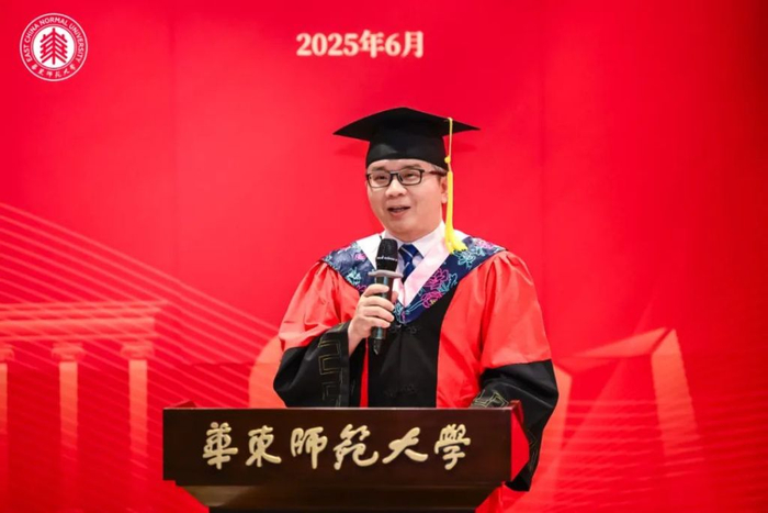 2025年6月20日,华东师范大学中国语言文学系2025届毕业典礼暨学位授予仪式举行,汤拥华致辞。“华东师大中文系”公众号图